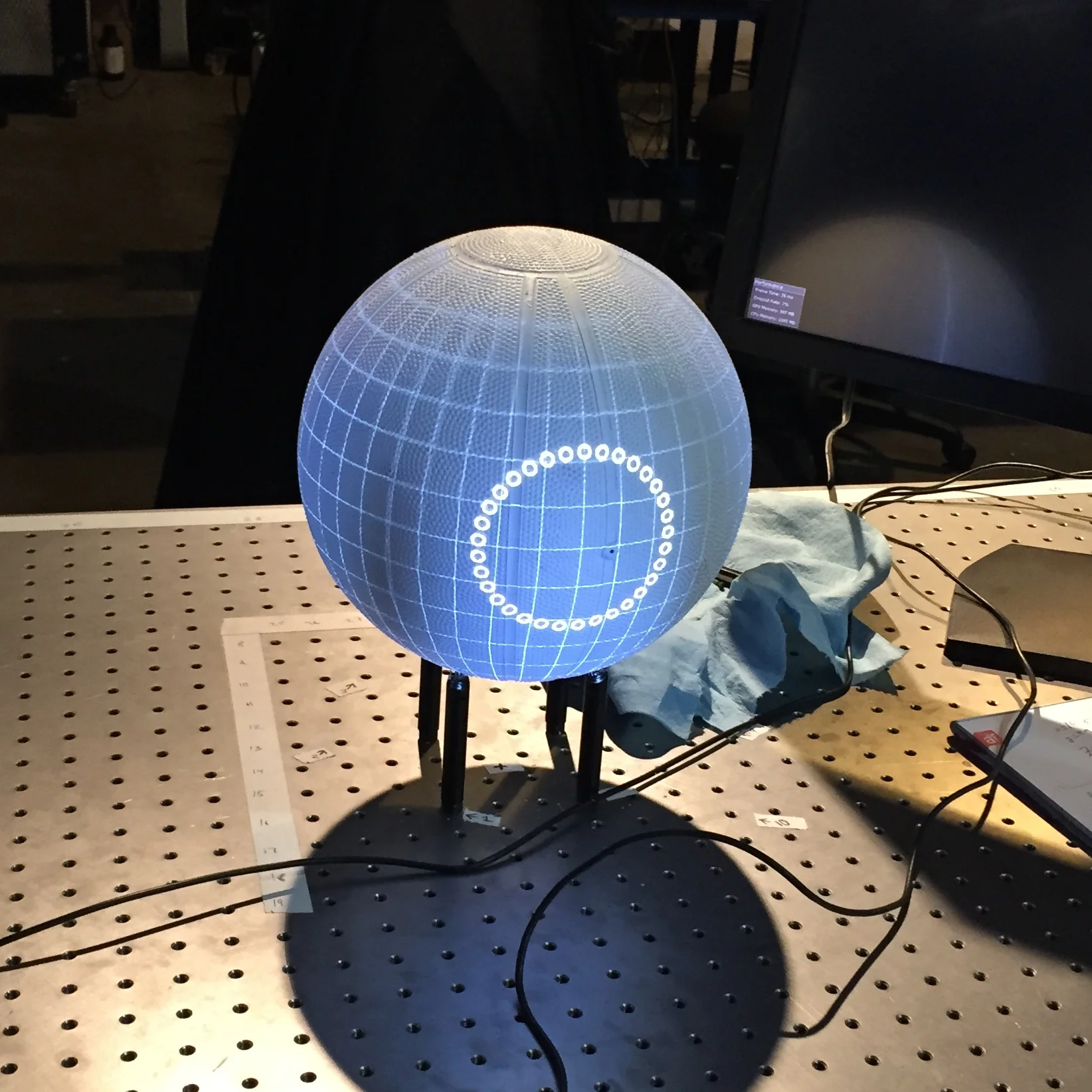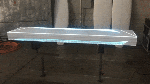 The system projected a heat map indicating where material needed to be removed or added to achieve the desired form. This example shows head tracking and perspective corrected rendering of a surfboard model, giving the user "X-Ray" vision of their final piece.
